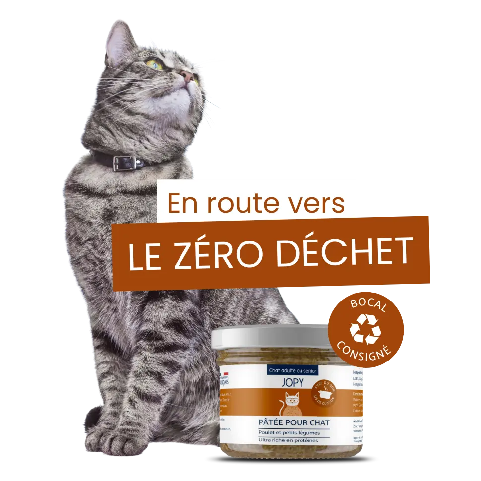 Face aux enjeux environnementaux, nous sommes fiers de proposer aujourd'hui des pâtées pour chat dans des bocaux consignés. En réutilisant nos emballages, cette initiative contribue à réduire l'empreinte écologique de nos produits et nous rapproche de notre objectif zéro déchet.