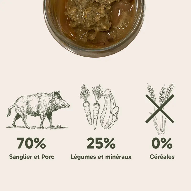 Nos pâtées, fabriquées en France près de notre entrepôt, sont composées de viande fraîche de sanglier français, d’abats nobles de porc français et de légumes. Cette proximité garantit fraîcheur, saveur et une empreinte écologique réduite grâce à des transports limités.